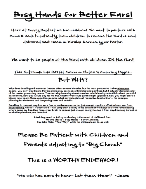 Here at Supply Baptist, we love children! We want to partner with Moms & Dads to patiently train children to receive the Word of God and we have two ways that happens. Optional Children's Church for the younger children (ages 4-6). And for the older children (7 & up) it's delivered each week in Worship Service, by our Pastor as they are occupied by Busy Books.